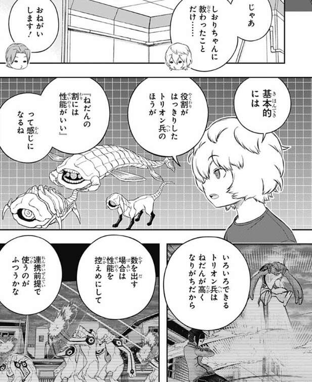 空閑も歌川の助け舟に乗っかり、宇佐美に教えてもらったという形にして、自分の考えを話し始めます。空閑は、基本的には役割がはっきりしたトリオン兵の方が、『ねだんの割に性能がいい』という感じなる、と言います。数を出す場合は性能を控えめにして、連携前提で使うのが普通だと空閑は言いますが、今回は連携には『援護』のコストがかかるので性能的にもねだん的にも微妙だと思う、と空閑は意見を言います。