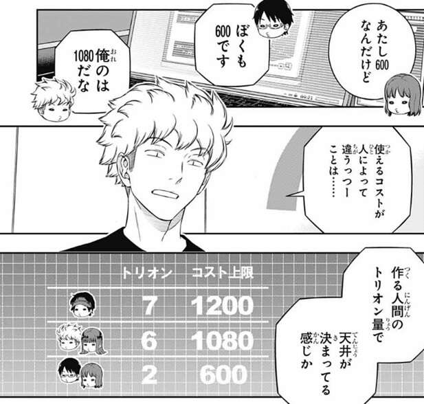 トリオン量によって作成コストが決まると分かり、二宮隊のようにトリオン量が多い隊員ばかりの所は、強いトリオン兵を使えて、諏訪7番隊は量産型のトリオン兵しか使えないってこと?と、叫びます。確かに雨取が作ったトリオン兵はかなり強そうで、香取は、やっぱクソゲーだわ!と、叫びます。しかし、『部隊(チーム)コスト』というのがあり12,000と表示されていて、この値が1試合で使えるユニットのコスト総数を表しているようです。つまり、強いトリオン兵は作成コストが高いので出撃できる数も少なくなり、弱いトリオン兵なら出撃できる数は多くできそうです。