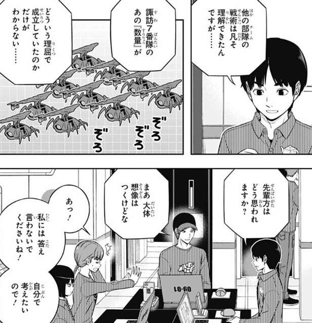 諏訪は理由として昨日、今日とシミュでバカ勝ちしているからと言い、どういう状況か分かるか?とメンバーに聞きますが、三雲が戦闘シミュの初めの頃の水上隊と二宮隊を例に出します。水上隊と二宮隊は戦闘シミュで初めの頃バカ勝ちしましたが、目立ってしまい対策をされて勝ちにくくなり、成績を落としました。諏訪は諏訪隊も総合2位まで上がって目立ってきたので、対策されるのは当たり前と言います。香取は、だったら今日は作戦を隠しておいて配点が高い2日目に作戦を使い、がっぽり得点を取ればよかったと言います。しかし、使えるユニットが決まっている戦闘シミュと違って特殊シミュは自由度が高いと諏訪は言い、三雲もどこかのチームが今日諏訪隊と同じ作戦をやってくる可能性がそこそこあったと言います。