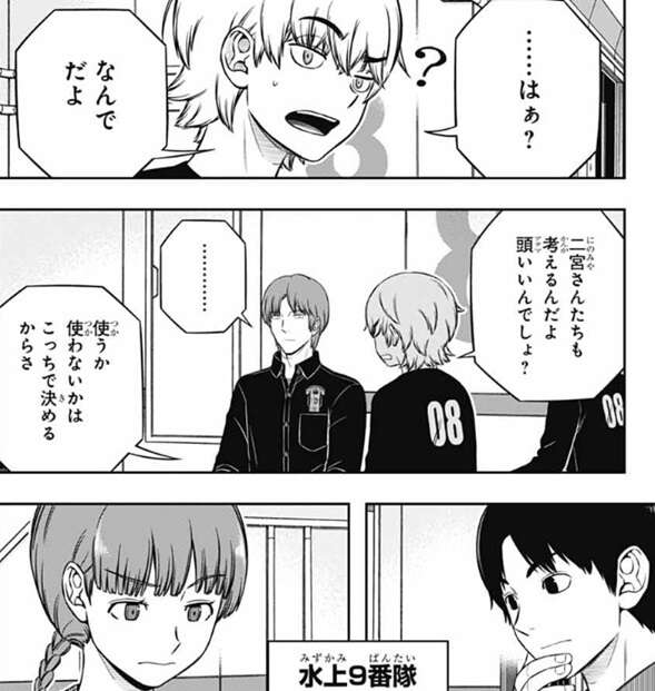 一方、樫尾は諏訪隊のトリオン兵の『数量』がどういう理屈で成立していたのか分からず、悩んで難しい顔をしていたようです。樫尾は先輩達に意見を求めますが、照屋は私には答えないでくださいね!自分で考えたいので!と、荒船に注意します。水上は頭の中で考えるより、トリオン兵つく~るいじながらのほうがわかりやすいんちゃう?と、照屋と樫尾にアドバイスします。もう答えが分かってそうな水上に照屋は、もう答えがわかってるんですね?と聞きますが、水上は分かっていないように振舞ってごまかします。