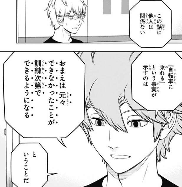 しかしヒュースは、この話に他人は関係ない、と断言し、『自転車に乗れる』という事実が示すのは、おまえは元々できなかったことが訓練次第でできるようになる、ということだ、とヒュースは若村に教えます。