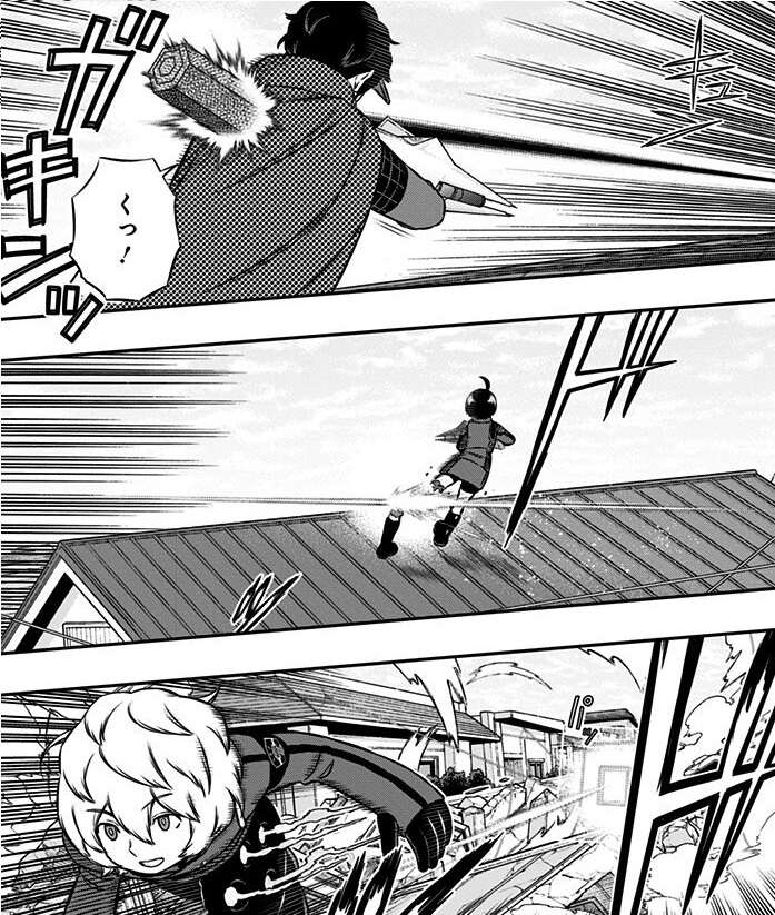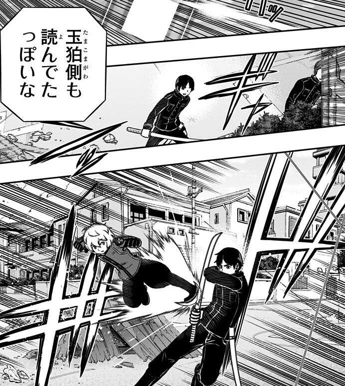 生駒隊が空閑を追いますが、空閑は追ってきた生駒と戦闘になり生駒を止めます。この隙にスナイパーの雨取は味方との合流を図りますが、王子隊の樫尾が邪魔をしてきて雨取は追尾鉛弾でかわそうとします。