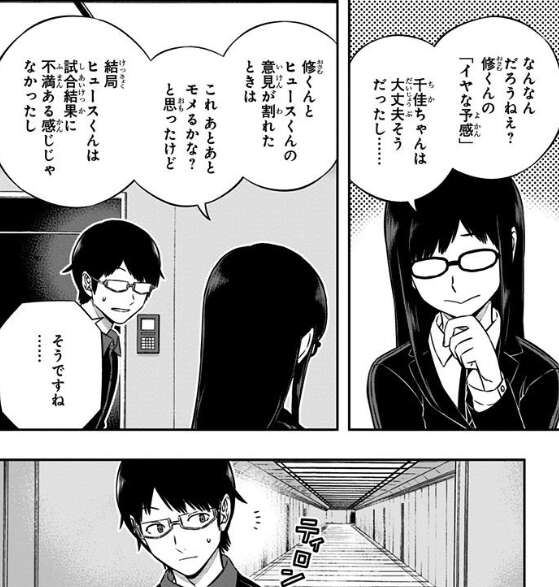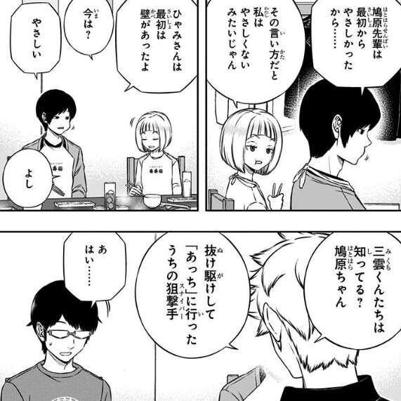 ヒュースの噂対策も上手くいき、三雲は小南や宇佐美、雨取と外に食事に行きます。小南の希望、肉を食べたいという事で焼肉屋に行くとそこで二宮隊と遭遇してしまいます。二宮隊の辻の意外な一面に驚きつつ、三雲は焼肉を楽しみます。その場で二宮隊が鳩原の事を話してきて、三雲は鳩原の事を聞き出そうとします。