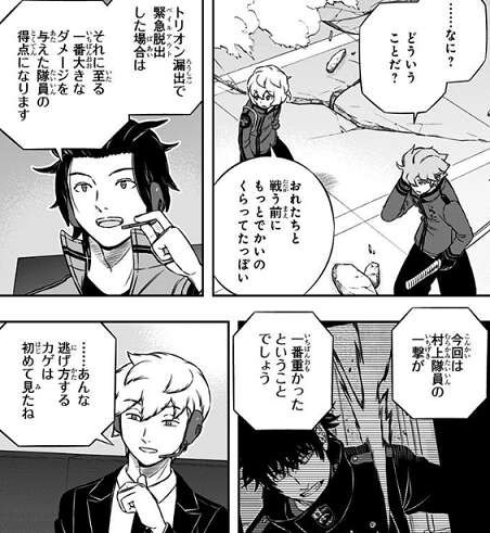 鈴鳴第一と影浦隊が倒されて、玉狛第2と東隊のみとなります。さらに玉狛第2は三雲が絵馬の狙撃でトリオン漏出が過多となっており緊急脱出してしまいます。ここで東隊はオプショントリガーのダミービーコンを起動し、攪乱を図ります。この作戦に三雲は雨取にメテオラを撃つように指示しますが、雨取のメテオラは規格外で本人も計算外でした。