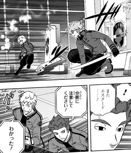 続いて鈴鳴第一と戦闘になりますが、来馬の両攻撃による弾圧と村上の剣圧により接近を阻まれ空閑とヒュースは鈴鳴第一に近寄れません。ヒュースがエスクードを展開しますが、村上の旋空弧月でぶった切られ近寄るどころか、玉狛第2は徐々に押し返されます。鈴鳴第一が若干有利な状況で、ヒュースはまたもエスクードを展開します。