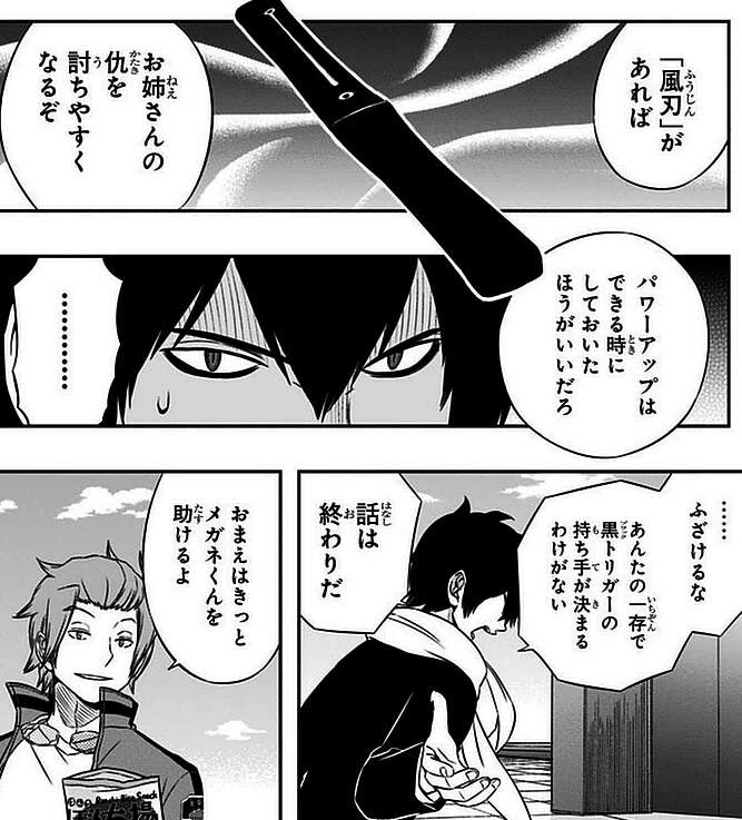 迅は今回の大規模侵攻の際に、三雲がどこかの局面でピンチなると予知し三雲を助けて欲しいと三輪 秀次に頼みます。その見返りとして、黒トリガー「風刃」の持ち手に三輪を推薦すると言い、「風刃」があればお姉さんの仇も討ちやすくなると言います。迅を個人的に嫌っている三輪は断りますが、迅は三雲を助けてくれるだろうと三輪に言います。