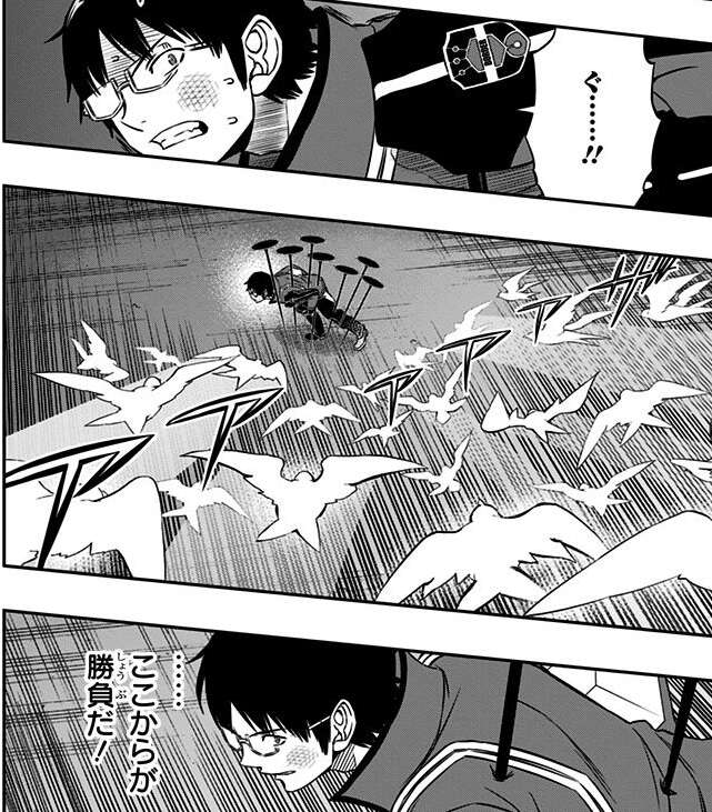 空閑はヴィザ相手に勝ち目は薄いですが、逃げるわけにはいかないと空閑はまず相手を奇襲するため、「響」印を使い下から攻撃します。しかし、ヴィザは「星の杖」に対して足元からの死角から攻撃してくるのは予想通りのようで、全くダメージを受けていません。