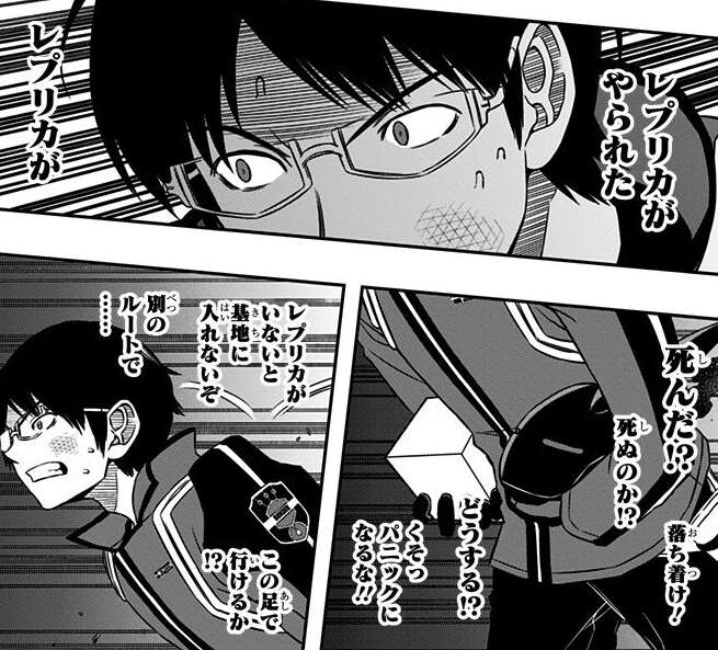 烏丸も緊急脱出しいよいよ後がありませんが、レプリカから突っ切るぞと言われ三雲は建物の中を突っ切ていきます。ハイレインの「卵の冠(アレクトール)」の特性をついていることに気づき、ハイレインはミラに下りてくるように命じます。